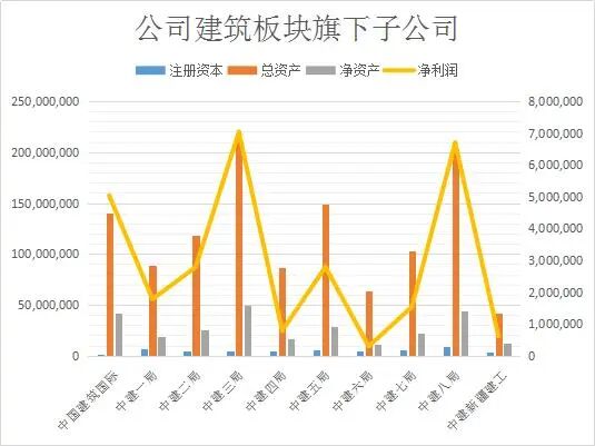 中国建筑的建筑施工业务旗下公司中规模和盈利能力基本成正比,主要以中建三局、中建八局、中建国际为首。