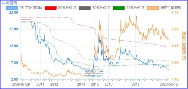现今中建的PE-TTM(扣非)为5.05,最大值可达到85.15,最小值是4.19,平均值为7.78,当前分位点为5.84%(意思是说整个上市期间,94%的时候市场反映的市盈率大于公司现在的PE-TTM)。