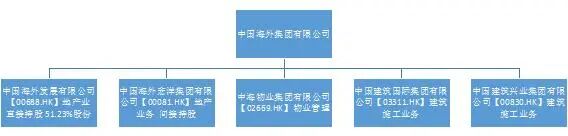 中海集团目前拥有五家上市公司:中国海外发展有限公司(00688.HK)持股比例51.23%、中国建筑国际集团有限公司(03311.HK)持股比例64.66%、中海物业集团有限公司(02669.HK)持股比例56.02%、中国海外宏洋集团有限公司(00081.HK)中国海外持股38.32%、中国建筑兴业集团有限公司(00830.HK)中国建筑国际对其持股74.06%。