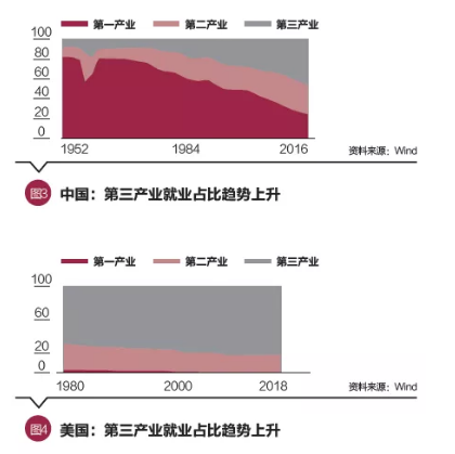 无接触经济昭示了新的增长点,尤其是服务业。这次疫情下的无接触经济将引导私人部门进一步加大数字经济的投资,同时也向政府部门、公共部门展示了新技术和新业态的潜力,但我们也需要关注风险的一面,其中之一就是对个人隐私的保护,这可以说是在数字经济时代如何平衡公平和效率的重要方面。 近日,世界银行和国际货币基金组织宣布2020年春季会议改成远程会议,这可以说是两大国际金融机构70年来第一次非现场举办重要的年度会议,当然这与全球疫情有关系,也显示了数字技术带来的种种可能。 无接触经济,可以简单地将其理解为不需见面就能完成的经济活动。新冠肺炎疫情下,我们看到很多此类经济行为,比如电商、生活服务、远程办公/医疗、线上娱乐/教育、在线销售、智能物流等(如图1),这离不开产业信息化、人工智能、数字技术等支持。可以说,无接触经济是数字经济的一部分,2020年因疫情而发展加速。新模式或技术能多大程度达到商业应用或社区应用,其实和不同路径的成本有关。在线互动的效果可能不及面对面互动,但疫情使得人与人当面互动的成本大幅提高,线下转线上就符合成本收益比了。 疫情过后有些无接触经济的发展可能放缓或不会持续,但这次疫情显示了数字经济发展的潜力,数字技术改变商业模式、社会管理方式的时代离我们更近了。从宏观经济的角度看将带来什么变化?数字经济的发展对生产效率、收入分配和公共政策有什么含义? 数字经济增加服务业可贸易性 这次疫情下,无接触经济主要发生在服务业。工人不能返工,机器无人操作(除非已实现自动化),相关制造业就难以复工。但通过远程通信、数字技术的应用,一些服务业可实现复工。传统经济学告诉我们,制造业是可贸易品,服务业是不可贸易品。因为商品可以跨境流动,但人不能自由跨境流动,服务业往往要求人与人之间互动。这次疫情的隔离措施限制人员流动,效果类似国家间的移民控制。无接触经济有助于克服人员不能自由流动的障碍,显示服务业可贸易的潜力。增强现实(Augmented reality,简称AR)、虚拟现实(Virtual reality,简称VR)技术的发展,第五代移动通信(5G)降低延时等,都增强了服务业的可贸易性。 数字经济时代服务业可贸易性增加已受到越来越多的关注。国际研究文献有个流行词Telemigration,可翻译成“远程移民”或“虚拟移民”。一个人没有移民,但通过信息通信技术和大数据应用被另一个国家的机构雇用,所以叫Telemigration。贸易一般指国与国之间,但大型经济体内部也存在可贸易和不可贸易之分。中国东部与中部、西部之间,商品是可贸易的,很多服务业过去是不可贸易的。无接触经济同样彰显了国家内部不同地区之间服务业的贸易潜力,我们要重新思考服务业在经济发展中的角色。传统上经济学对服务业不太瞧得上。亚当·斯密的《国富论》质疑甚至讽刺乐师、牧师、律师对社会的价值。马克思的《资本论》说,生产活动需要服务业的支持,但服务业本身不创造价值。现在人们对服务业价值的认知已发生变化,但有个观点现在仍得到很多人认同,即服务业生产效率提升慢。经济学家鲍莫尔(Baumol)在1967年举的一个例子被广为引用,他说虽然有几百年的技术进步,音乐会四重奏还是需要四个人。 服务业可贸易对生产效率的含义 我们怎样理解过去二三十年,尤其是过去10年,全球劳动生产率增速下降?不仅是美国(图2),还有欧洲、日本、中国等国家。对于美国劳动生产率增长速度放慢,经济学文献主要有三种解释。 一是统计误差。数字经济的重要特征是一些经济活动边际成本接近零。比如过去听一首歌需要买唱片,现在通过数字技术无数人可以享受同一首歌,它的边际成本是零。边际成本是零的经济活动不一定体现为货币价值,没有包括在国内生产总值(GDP)里,进而没有体现为劳动生产率的提升。二是通用技术渗透需要时间,就像电发明以后,电力对整个经济的渗透持续几十年时间,体现在劳动生产率方面是个渐进的过程。三是某个或某些领域技术进步导致整个经济劳动生产率增长速度放慢。一个部门劳动生产率提升,比如粮食生产或冰箱制造的劳动生产率提升,现实生活中人们需求有限,生产效率提高到一定程度后,必然导致剩余劳动力,而剩余劳动力一般会转移到生产效率不够高、供给不够多的行业和产品上。由此导致社会资源转移到生产效率比较低的部门,使得这类部门在整个经济里所占比重增加。按照权重来算,总体劳动生产率增速就没有先进部门那么快,甚至是放慢的。这在经济学文献里被称为“鲍莫尔病”(Baumol Disease)。即进步部门劳动生产率提升,产量增加,但需求有限,剩余劳动力从进步部门转移到停滞部门或效率低的部门。也就是说,总体劳动生产率放慢,不一定是没有技术进步,或技术进步没有提高劳动生产率,而是技术进步导致社会资源更多地分配到生产效率低的行业。一般来讲,服务业的生产效率提升较慢,随着技术进步可能会带来服务业占用资源增多。中国第三产业就业占比在过去几十年不断上升,第一产业和第二产业占比下降,美国更是如此(图3、图4)。 数字经济提升服务业的可贸易性,促进生产效率的提升。原因包括:一是贸易带来竞争,竞争会提高效率。二是贸易使得规模经济成为可能,因为市场规模增加了,边际成本下降。最