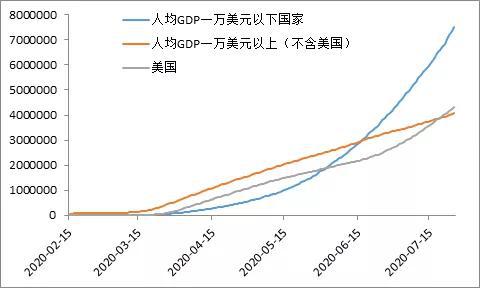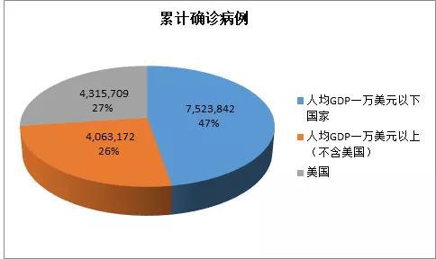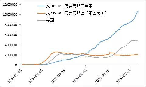 过去一周的新增病例中,人均GDP一万美元以下的国家占比约60%,美国占比约28%,其余人均GDP一万美元以上的国家占比约12%。