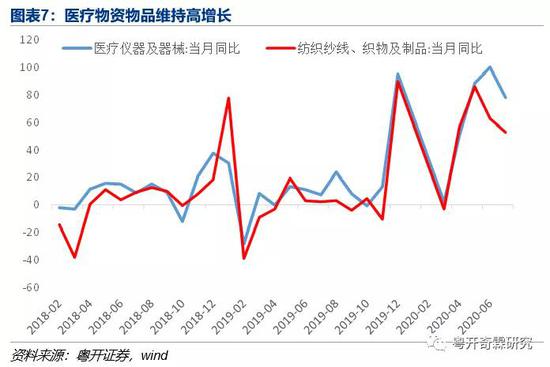 5)与医疗物资相关的出口增速下降,但绝对增速还是维持高位。医疗仪器及器械同比还维持着78%的高增长(前值是99%),纺织纱线、织物及制品同比52%(前值52.5%)。不过与医疗物资相关的出口我们到不担心会下降很快(虽然增长高峰肯定过了),因为海外疫情还很严重,海外是在疫情扩散阶段重启的经济,对医疗物资的产品需求不可能很快就降下来。