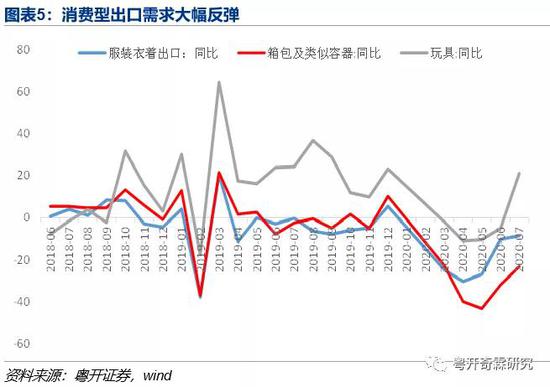 3)与消费需求相关的出口继续反弹,无论是服装衣着、箱包及类似容器还是玩具,同比均大幅反弹或降幅收窄,分别为-8.54%、-23.24%和21.12%(前值分别为-10.2%、-31.91%和-5.04%),与海外零售数据恢复的趋势是一致的。海外经济重启激活了消费需求,开始拉动中国相关的出口产品,这个对中国的就业压力缓解是利好,毕竟,消费出口产品不少劳动密集型产业。