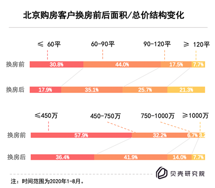 总价方面,2020年(1-8月)北京购房客户换房后套均总价达到588万,平均每换一套房成本相较置换前要增加116万元;面积来看,置换客户套均面积达到96平方米,换房后套均面积增加18平方米,扩客厅、加卧室,18平米的面积相当于至少会多出了一个独立空间。