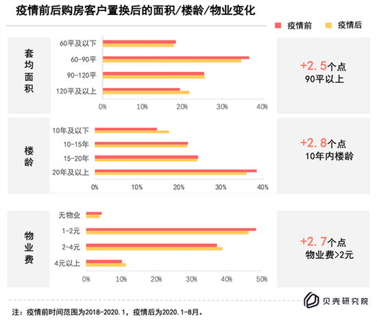 从置换面积看,疫情后,换房客户购买90平方米以上房源占比44.9%,这一比例要比疫情前高出2.5个百分点。从楼龄看,在疫情之后购买10年内房源占比14.8%,相较疫情前高出2.8个百分点。物业方面,在疫情过后购买品质物业(物业费超过2元/月/平)小区的比例为50%,较疫情前高出2.7个百分点。