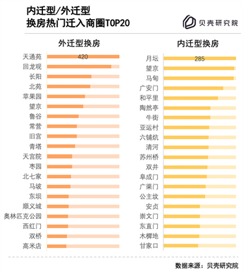 研究将视角放到了城市商圈层,通过分析1.5万余条商圈间换房迁移路径发现,在北京外迁型换房热门迁入商圈包括天通苑、回龙观,长阳等,多属于四环外的商圈;而内迁型换房热门迁入商圈有月坛、望京、马甸等,这里的教育资源丰富、周边工作机会多。其中,前二十热门迁入商圈分别占到外迁型和内迁型换房总量的43.2%、31.0%,集中趋势较为明显。