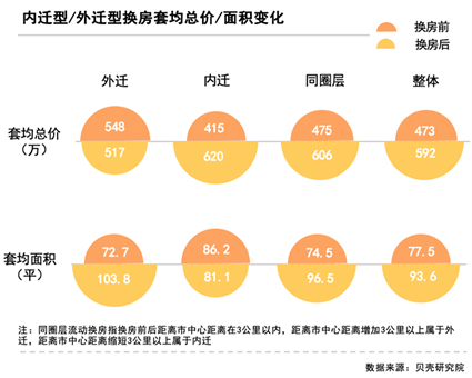 但是,内迁型和外迁型换房在换房前后房源总价、面积的变化上则差异较大。