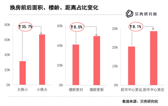 此次调研的数据显示,三分之一换房人群换房后新居所面积更小了,超四成换的房子比之前的房子楼龄更大,超两成换房人群搬向了离市中心更远的地方。