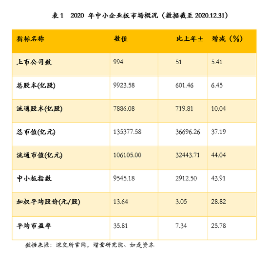 截至2020年12月31日,中小板共有994家上市公司,总市值为135,378亿元,占深交所总市值的39.59%,流通市值为106,105亿元,占深交所总流通市值的40.25%。2020年中小板IPO公司家数为54家,比上年增加28家,同比增加107.69%;IPO筹资额为372.29亿元,比上年增加27.62亿元,同比增加8.01%。