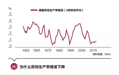 我们怎样理解过去二三十年,尤其是过去10年,全球劳动生产率增速下降?不仅是美国(图2),还有欧洲、日本、中国等国家。对于美国劳动生产率增长速度放慢,经济学文献主要有三种解释。