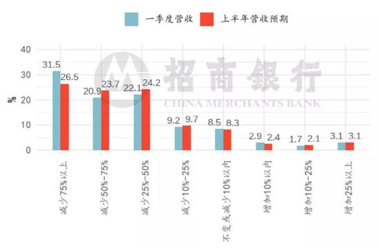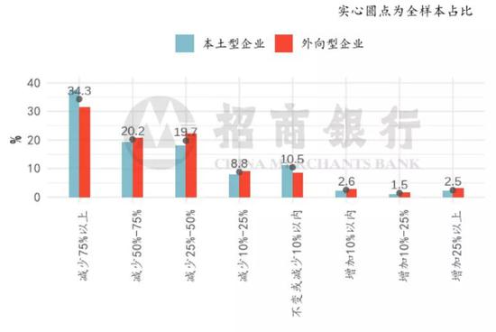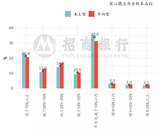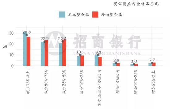 五成外向型企业一季度营收下滑超过50%,收缩幅度略好于本土型企业。尽管外向型企业复产较快,但一季度营收依然受到显著冲击:本土/外向型企业一季度营收下滑超过50%的占比分别为53.0%/50.2%,其中营收下滑超过75%的本土/外向型企业占比为37.6%/ 31.5%。两类企业中,一季度营收增加的企业占比均不足一成,本土/外向型分别为5.7%/7.7%。