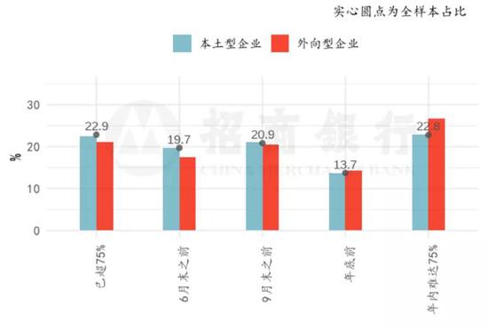 受疫情全球扩散影响,外向型企业对未来的预期较本土型企业更悲观。在被问及何时产能可恢复至75%以上时,仅有58.9%的外向型企业表示三季度前可以恢复,而本土型企业认为能恢复的超过六成(63.4%);认为年内无法复产达75%的外向型/本土型企业占比为26.7%/22.8%。