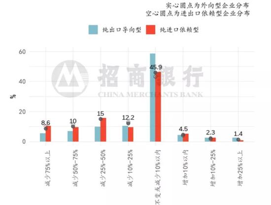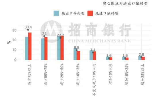 受访的外向型企业同时受到海外供需变化的负面影响,需求影响大于供给。为评估供需两端的影响幅度,我们可以单独观察纯出口导向型企业和纯进口依赖型企业,纯出口导向型企业仅受到海外需求的影响,纯进口依赖型企业仅受到海外供给的影响。