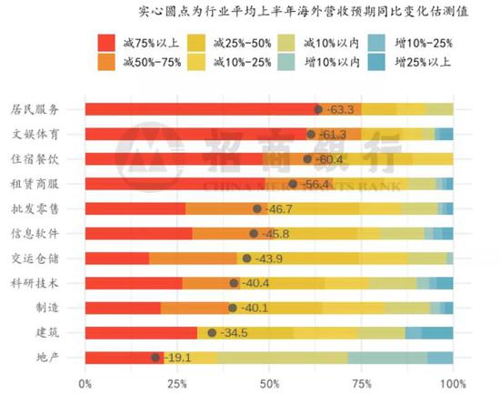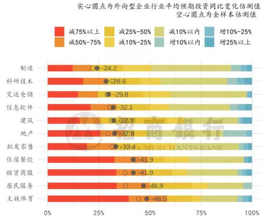 从行业分布看(括号中为该行业纯出口导向型企业海外营收预期增速),需求端受海外影响较大的行业为居民服务(-63.3%)、文娱体育(-61.3%)、住宿餐饮(-60.4%)、租赁商服(-56.4%)。