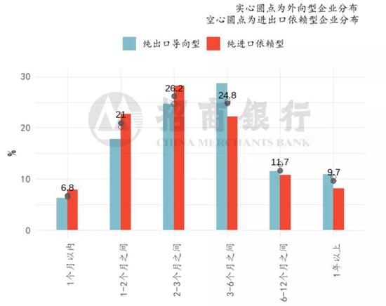 从外向型企业的细分子类看,进出口依赖型的企业的现金流情况与外向型企业整体分布高度吻合;纯出口导向型企业优于纯进口导向型企业,也好于外向型企业的整体表现。纯出口导向型企业现金流可维持时长超过3个月的企业占比51.2%,高出纯进口依赖型企业10pct。