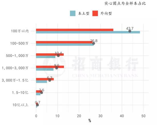 外向型企业的营收规模却显著高于本土型企业:营收规模超过500万的企业中,外向型企业占比37.7%,超出本土型企业12.9pct。