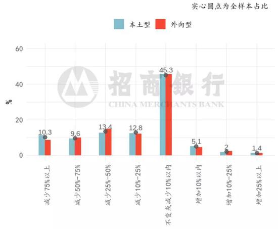 受访企业上半年的雇员计划环比变化显示,本土型、外向型企业和全样本分布高度一致,外向型企业较好的现金流状况并未反映在上半年雇员计划中,45.9%的外向型企业上半年计划缩减雇员10%以上。