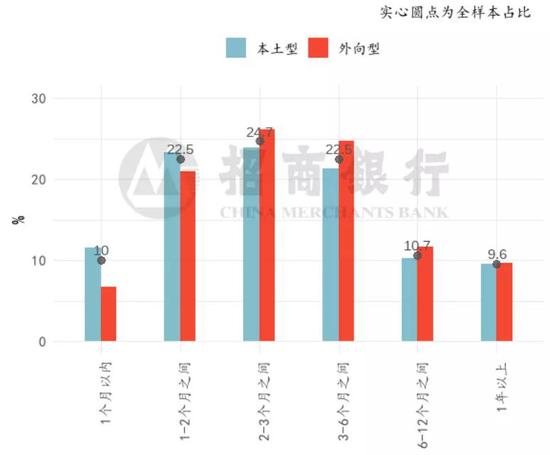 在疫情带来的极端冲击下,企业的生存能力很大程度上取决于其现金流。外向型企业的现金流情况略好于本土型企业:正态分布假设下,外向/本土型企业平均现金流可支撑生存时长分别为4.6/4.3个月。其中现金流维持时长低于1个月的外向/本土型企业占比为6.8%/11.6%;现金流可维持时长超过3个月的外向本土型企业的占比为46.1%/41.2%。外向型企业的现金流分布亦优于全样本分布(本土型企业在全样本中占比较高)。