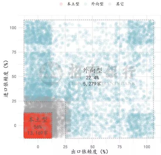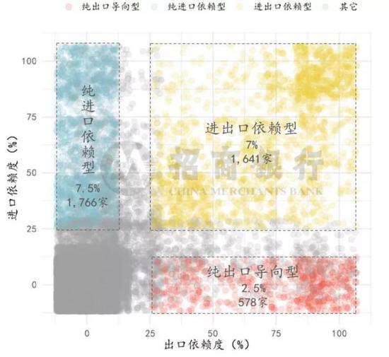 外向型企业是本文分析的重点,又可进一步细分为三类:纯进口依赖型(进口依赖度25%以上,出口依赖度0%),纯出口导向型(出口依赖度25%以上,进口依赖度0%)和进出口依赖型(进出口依赖度皆大于25%)。