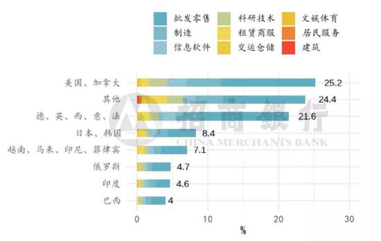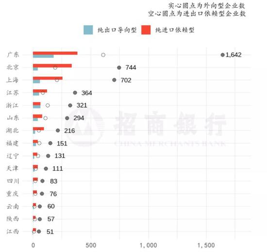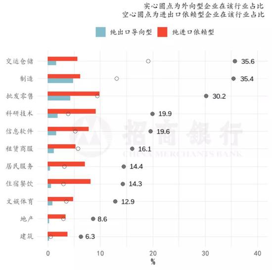 从纯进口依赖型的企业在行业占比看,批发零售(9.9%)、科研技术(9.2%)和住宿餐饮(8.2%)占比最高;纯出口导向企业中,制造(4.8%)、批发零售(4.3%)和科研技术(1.9%)位于前列;而进出口依赖型占比前三的行业分别是交运仓储(19.1%),制造(13.1%)和批发零售(9.4%)。