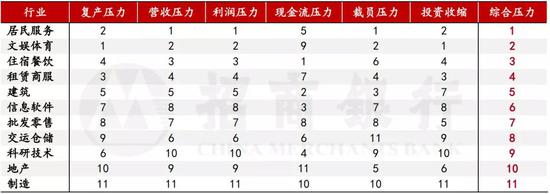 注:1. 本文简化了各大类行业的名称(简称与全称的对应关系参见附表); 2. 数值表示行业在该分项中的排名,数值越小表明压力越大;3. 综合压力为所有分项指标标准化后的加权平均。