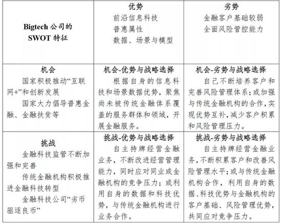 BigTech公司发展开放金融的SWOT:优势是掌握前沿信息科技,边际成本低,普惠属性明显,具备风控所需的数据、场景、技术与模型优势;劣势是金融客户基础缺乏,金融风险管控实践经验积累少,全面风险管理体系有待进一步加强;机会是国家积极推动“互联网+”和创新发展,大力倡导普惠金融和金融扶贫;挑战是金融科技监管力度不断加强和监管体系不断完善,传统金融机构正在利用信息科技改革业务模式和推进产品创新,以及一些金融科技公司恶性竞争和“劣币驱逐良币”(见表1)。
